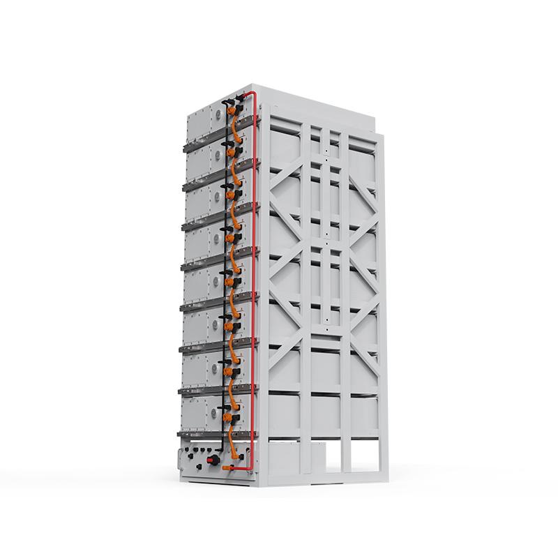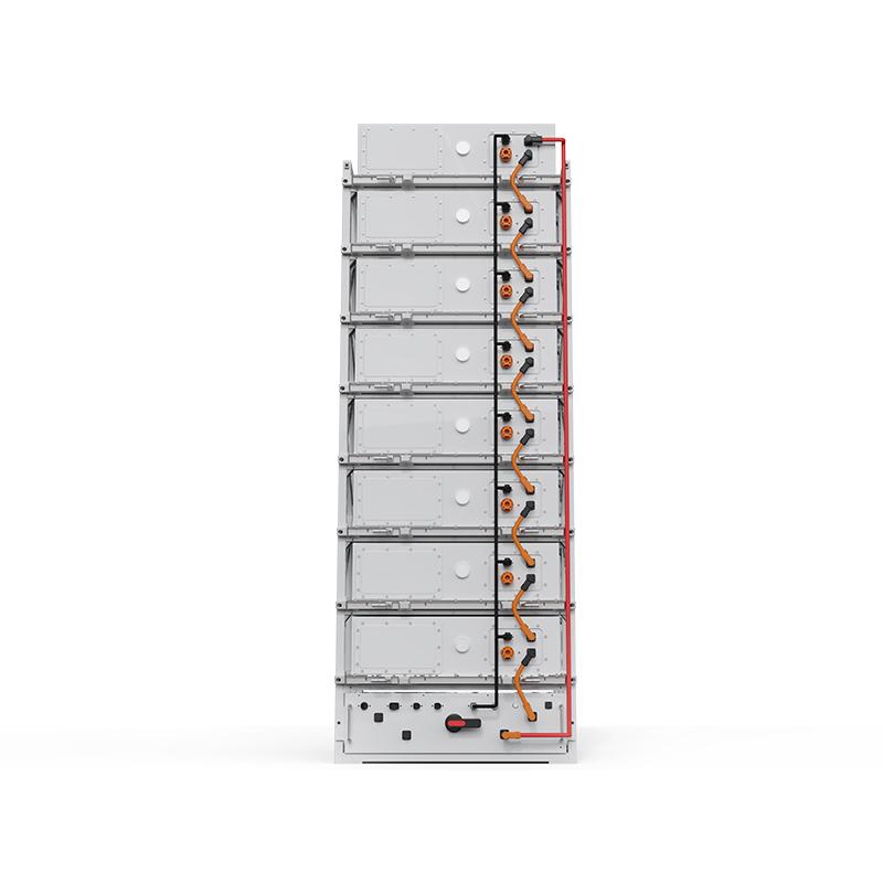 电池簇由5个电池箱和1台高压箱组成,电池箱串联后接入高压箱。电池箱和高压箱纵向排列安装于电池架。电池架采用1列9层结构方式,高压箱安装于最底层。